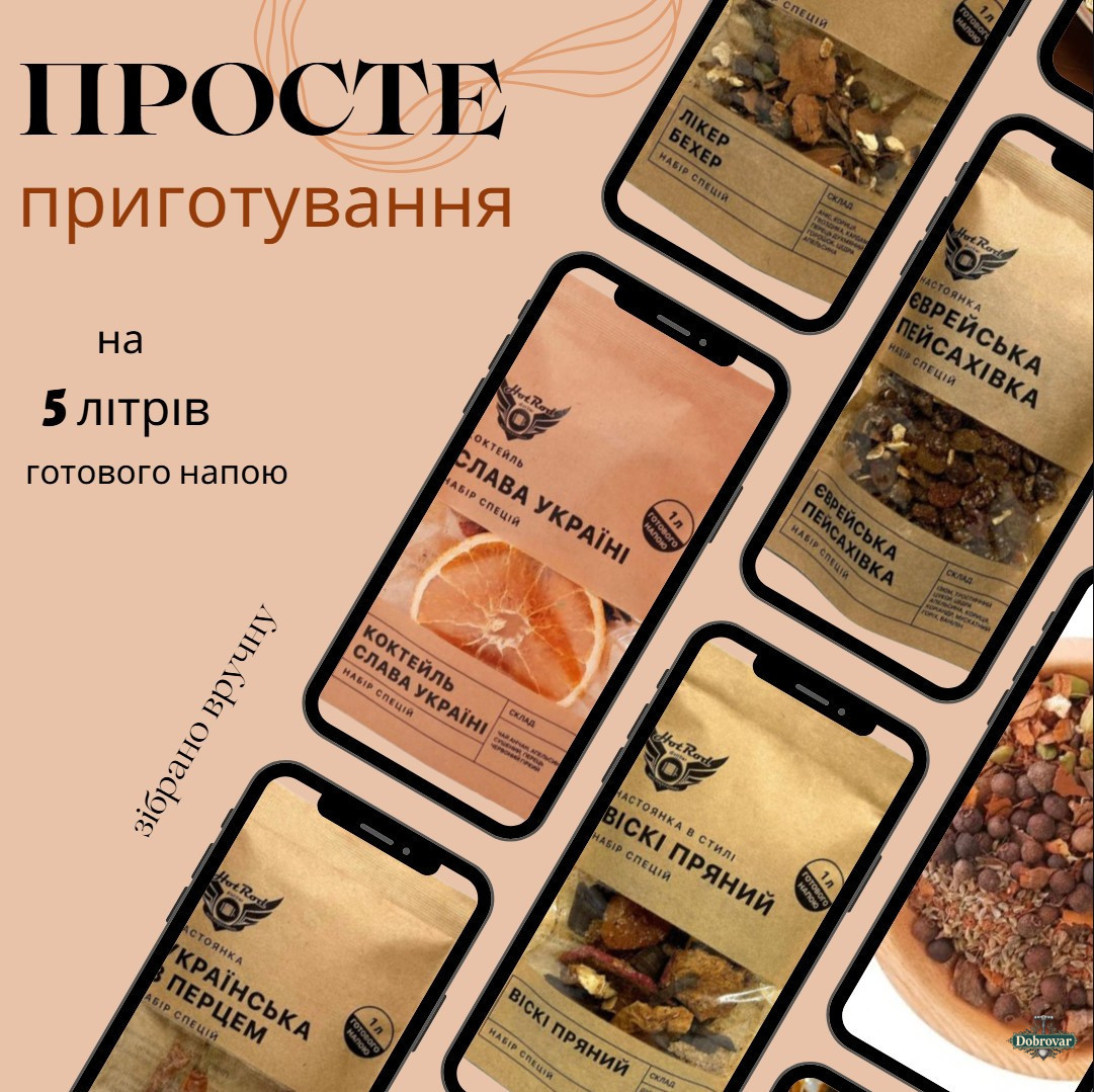 До набору входять 5 ретельно підібраних сумішей натуральних спецій, кожна з яких розрахована на 1 літр напою. Завдяки збалансованим рецептарам ви легко зможете перетворити звичайний напій на ароматну авторську настоянку з глибоким смаком.