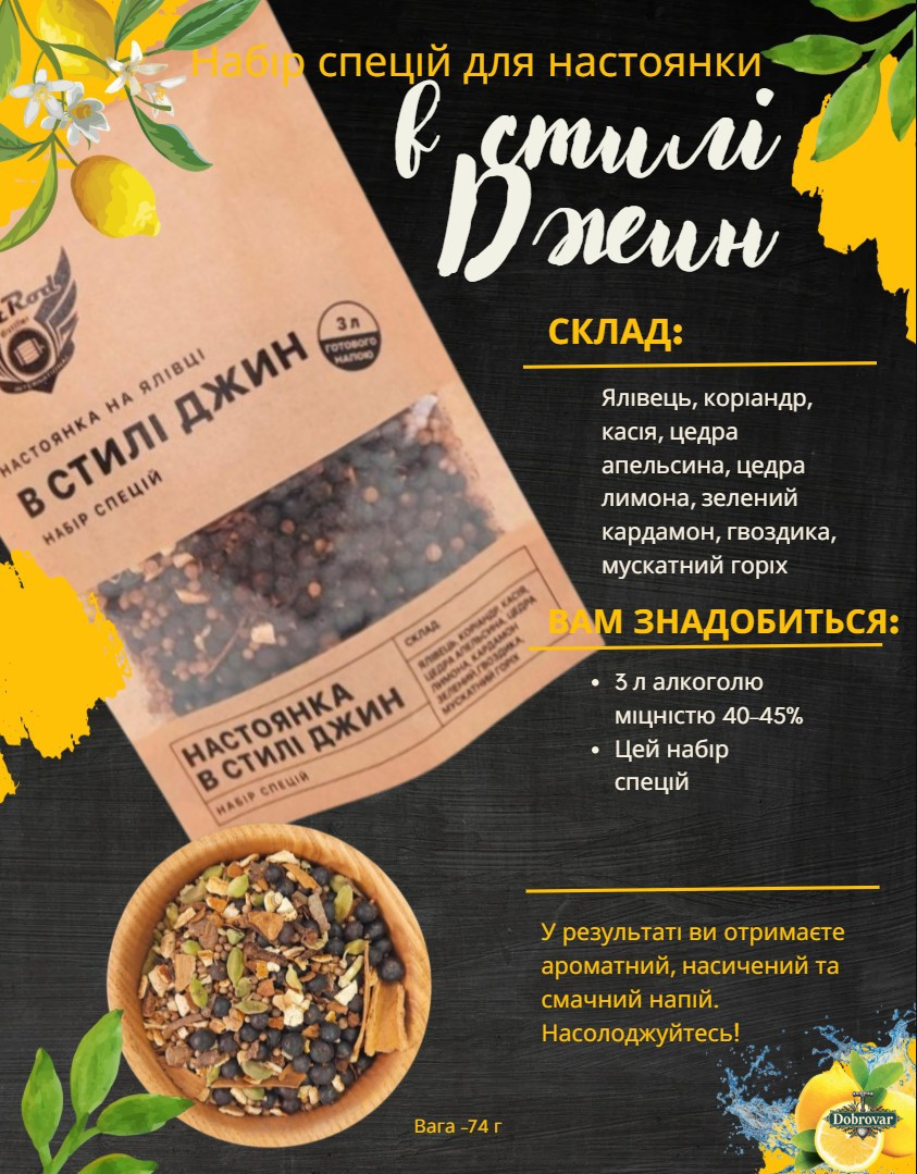 Усередині ви знайдете 10 ретельно підібраних сумішей, які допоможуть відтворити популярні світові алкогольні стилі прямо в себе вдома. Завдяки натуральним спеціям, травам і ароматним інгредієнтам ви зможете перетворити звичайний дистилят на багатогранний напій із глибоким ароматом і насиченим смаком.