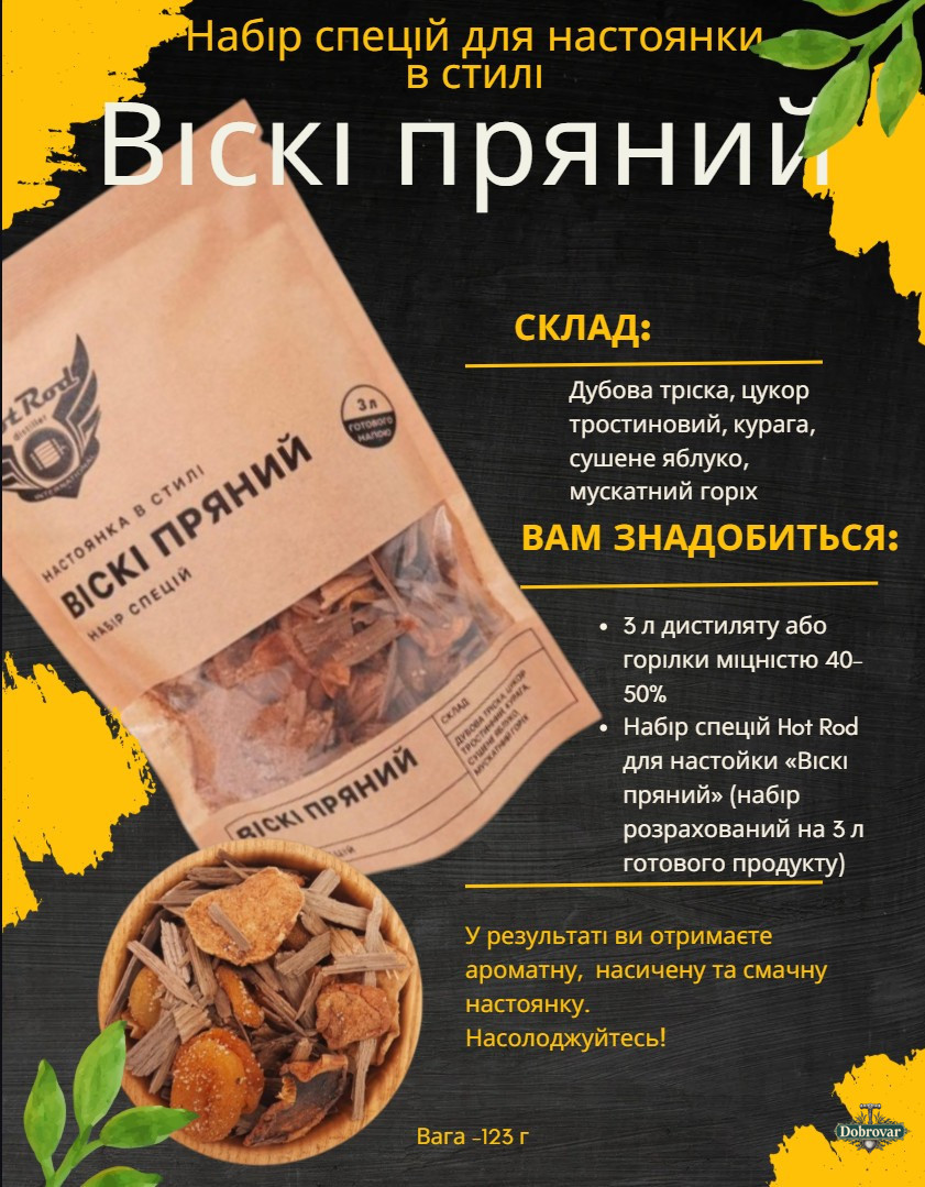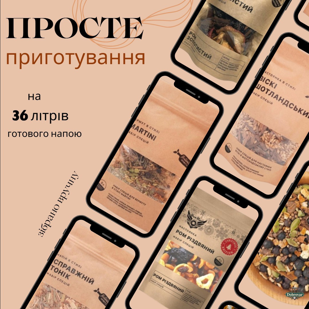 Усередині ви знайдете 10 ретельно підібраних сумішей, які допоможуть відтворити популярні світові алкогольні стилі прямо в себе вдома. Завдяки натуральним спеціям, травам і ароматним інгредієнтам ви зможете перетворити звичайний дистилят на багатогранний напій із глибоким ароматом і насиченим смаком.