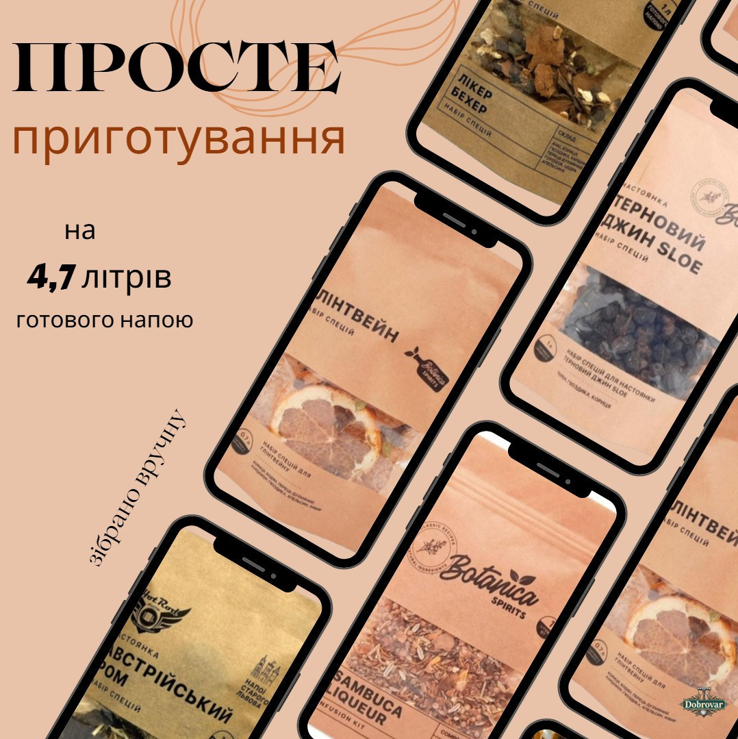 До комплекту входить 5 унікальних сумішей, кожна з яких розрахована на приготування 1 літра напою. Це ідеальне рішення як для новачків, так і для тих, хто вже захоплюється домашніми настойками, лікерами або експериментує з авторськими рецептами.