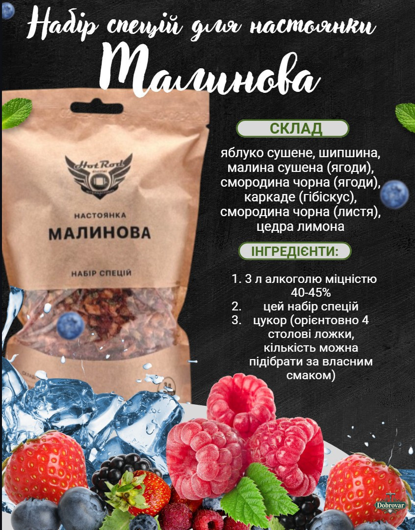 Цей елітний набір створений для приготування до 20 літрів ароматних настоянок у домашніх умовах. У комплекті — 8 ретельно підібраних смакових композицій на основі ягід, спецій і трав, які дають змогу легко перетворити звичайну горілку або самогон на насичений, багатогранний напій із природним ароматом.
